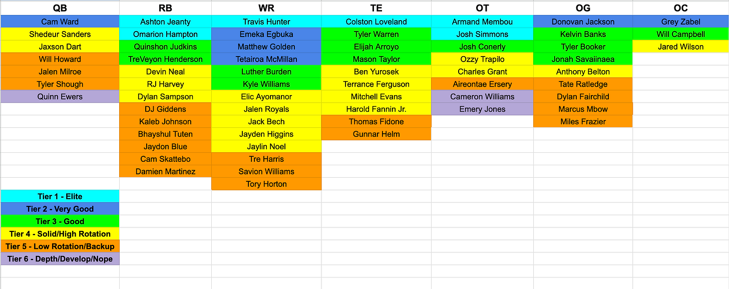 My final 2025 NFL Draft Horizontal Big Board is finally complete. I studied 139 prospects for this year's draft and ranked/tiered them all.